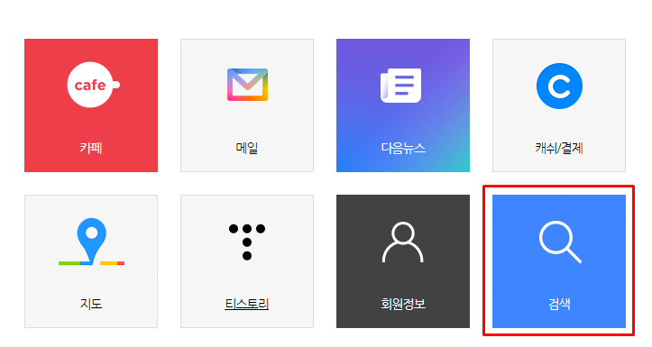 ์นดํ, ๋ฉ์ผ, ๋ค์๋ด์ค, ์ง๋๋ฑ ๋ค์ํ ์๋น์ค์ ๋ํ ์นดํ ๊ณ ๋ฆฌ๊ฐ ์ค๋น๋์ด ์์ต๋๋ค. ์ฌ๊ธฐ์ ์ํ๋ ์๋น์ค๋ฅผ ์ ํํฉ๋๋ค. '๊ฒ์'์ ์ ํํด ๋ณผ๊ป์.